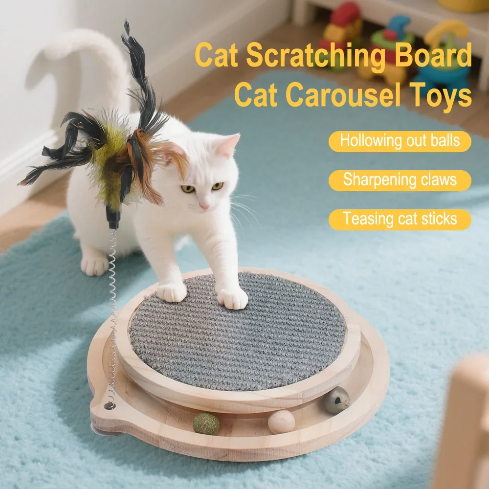 Functions: Cat scratches the board and grinds the claws, tease the cat, plays with the turntable, and plays with the feathers